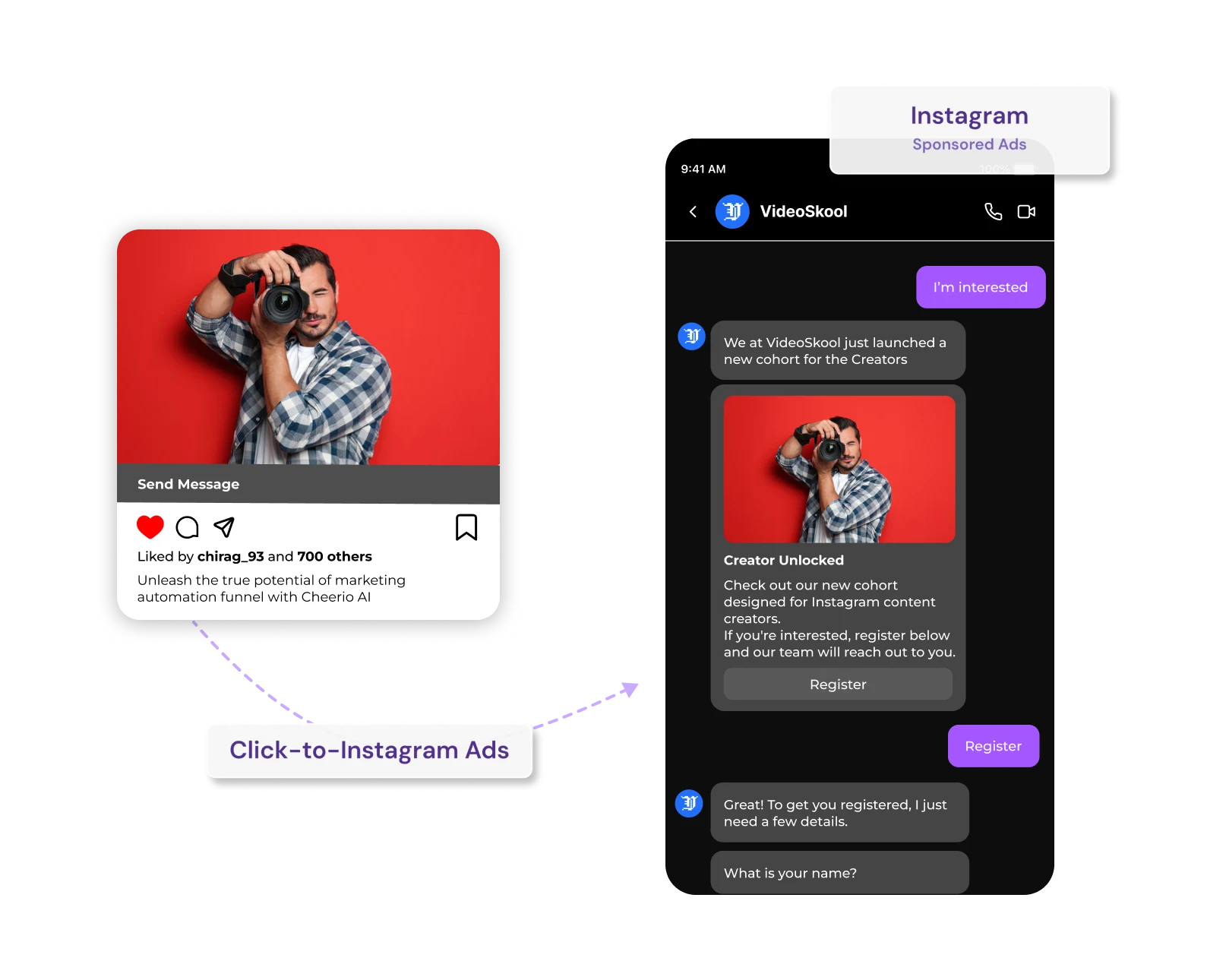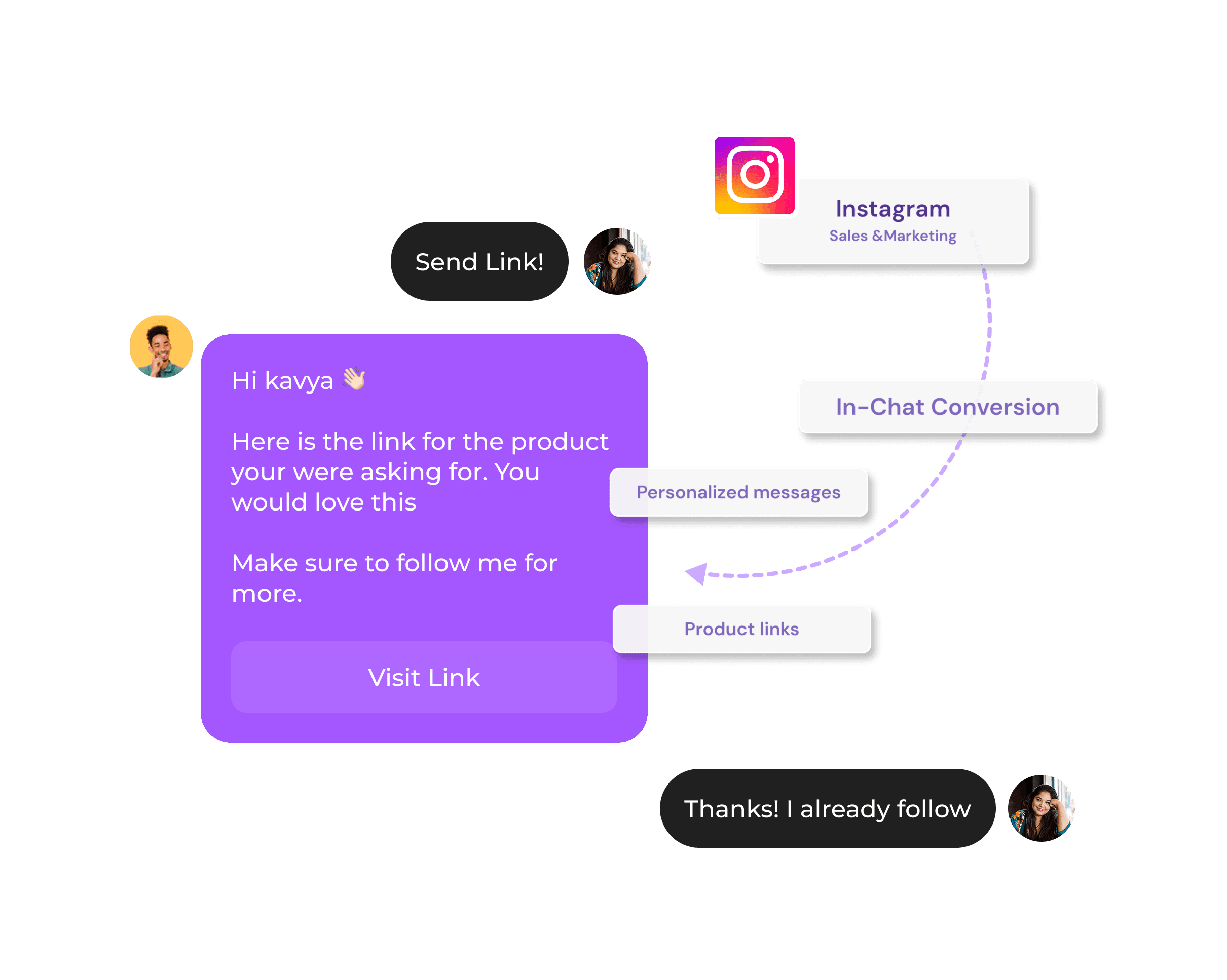 Send users directly from ads into automated Instagram conversations. Engage leads immediately while intent is fresh without relying on static landing pages.