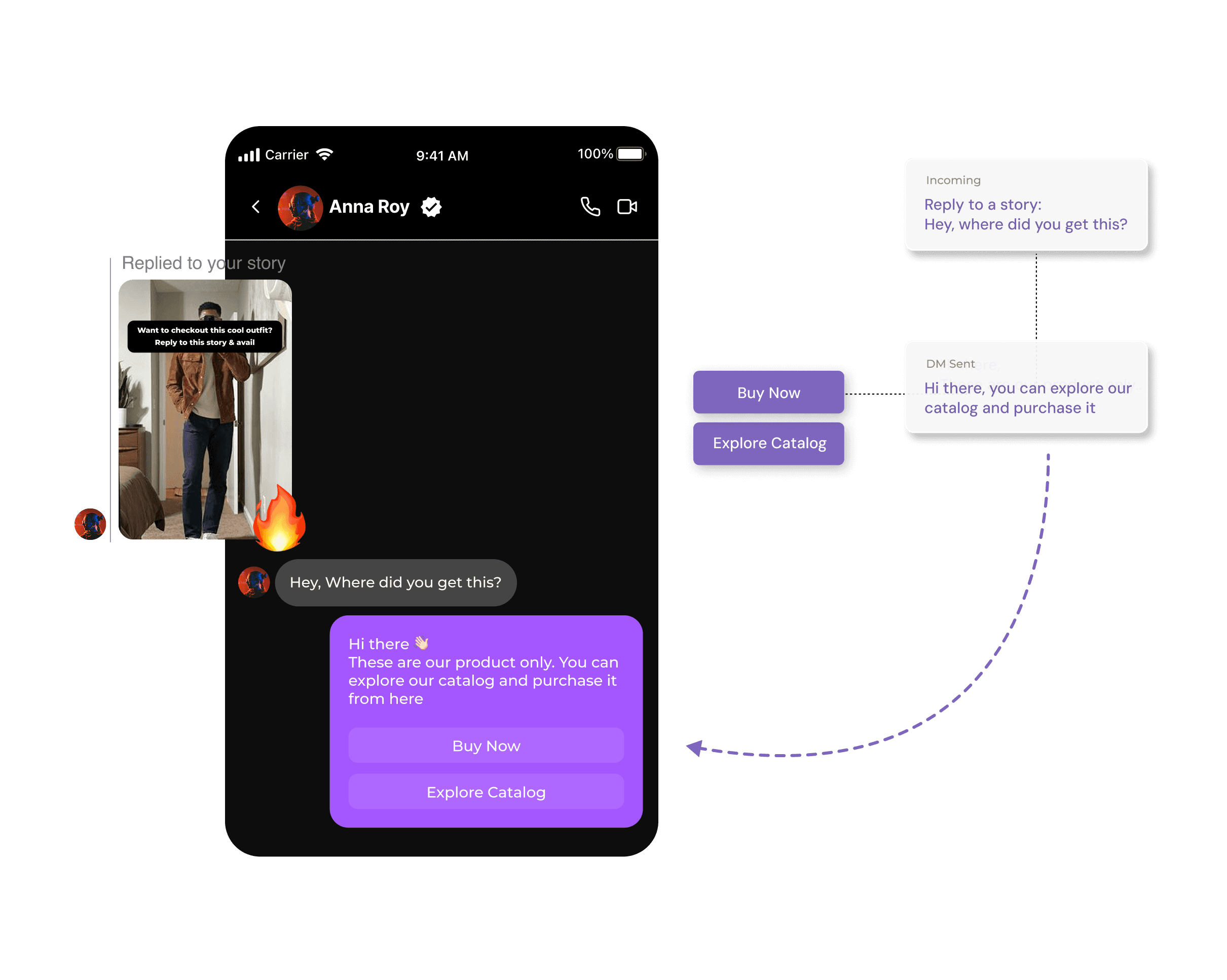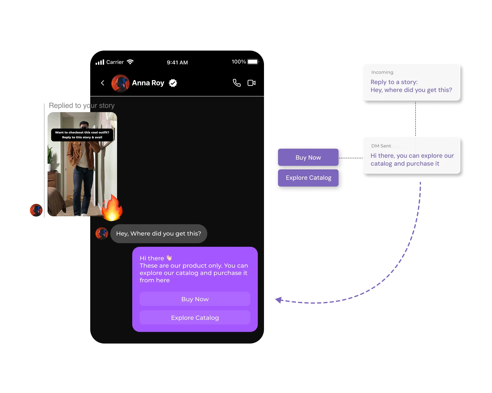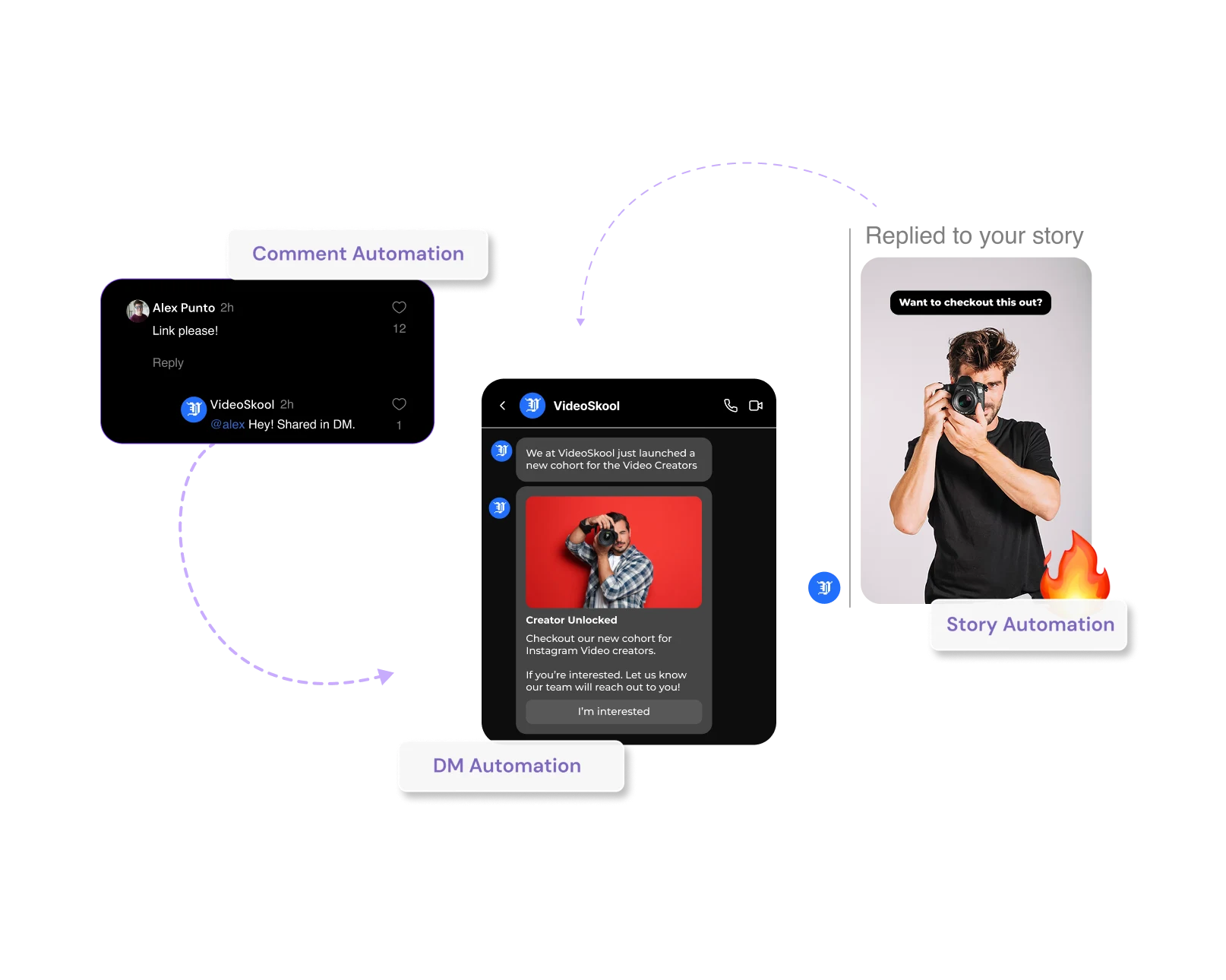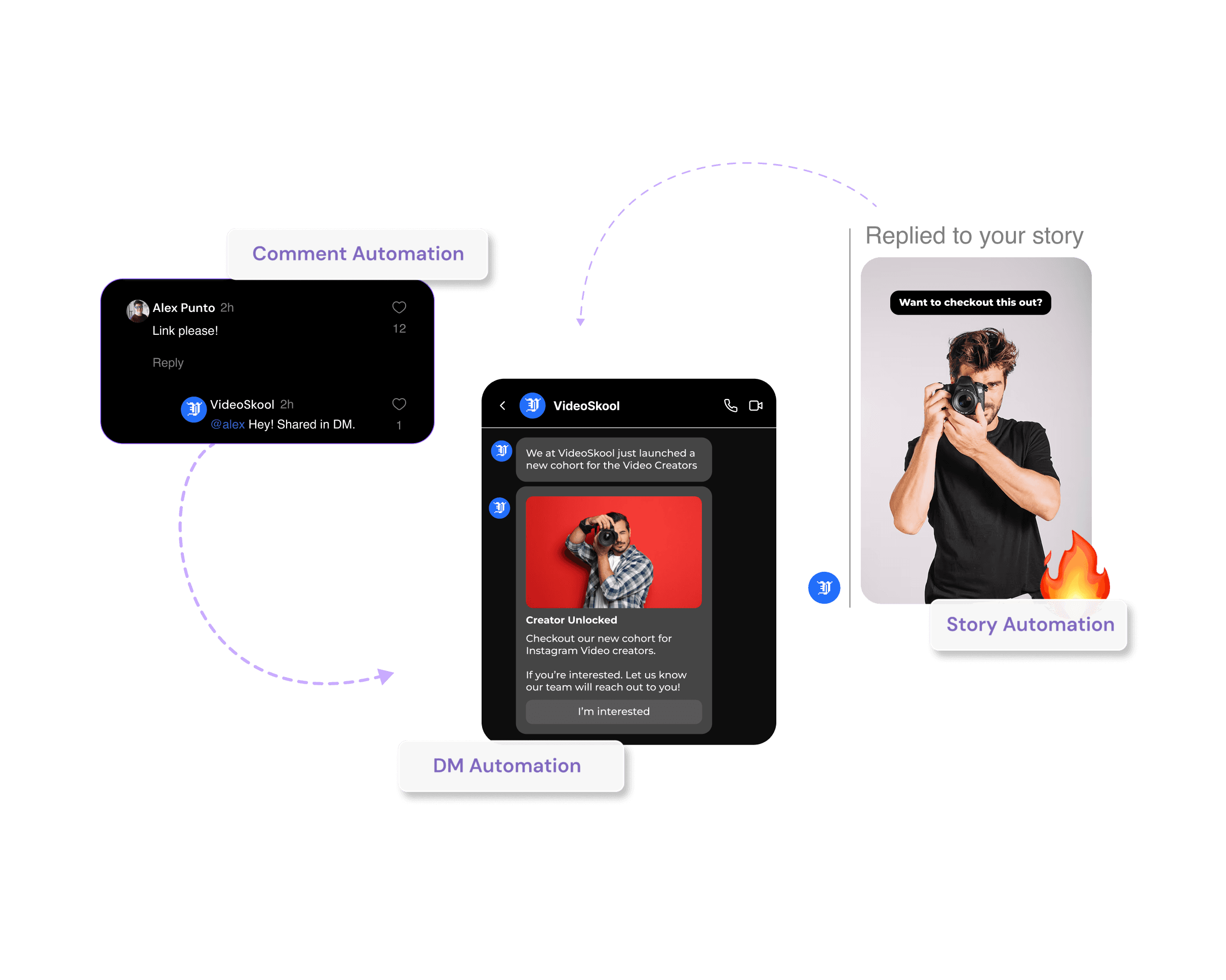 Automatically respond to comments, DMs, and story replies the moment users engage. Move public interactions into structured one-to-one conversations that capture intent and drive action, while interest is still high.
