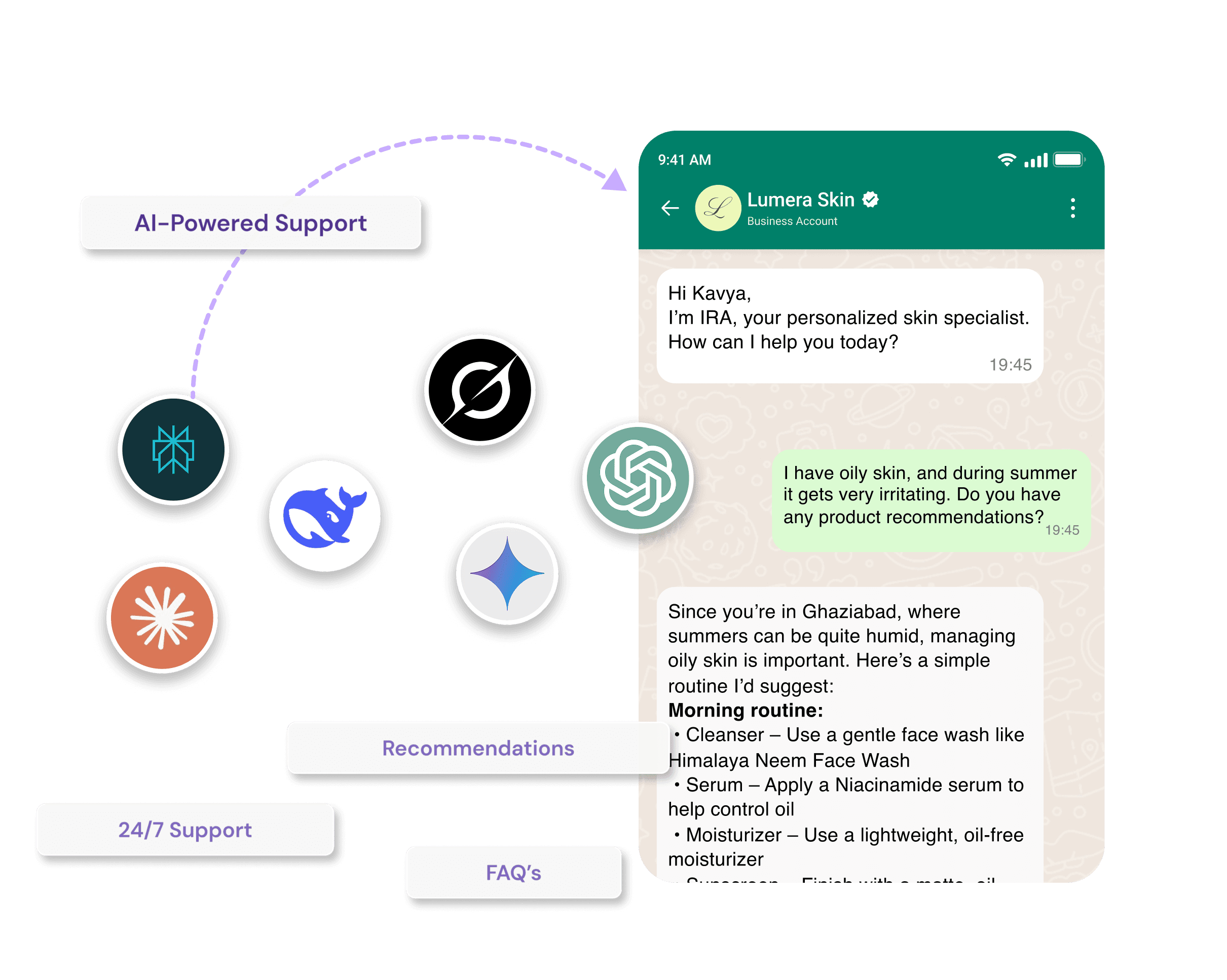 AI assistants answer FAQs, recommend products, and resolve routine queries instantly. When needed, conversations move to human agents with full context.
