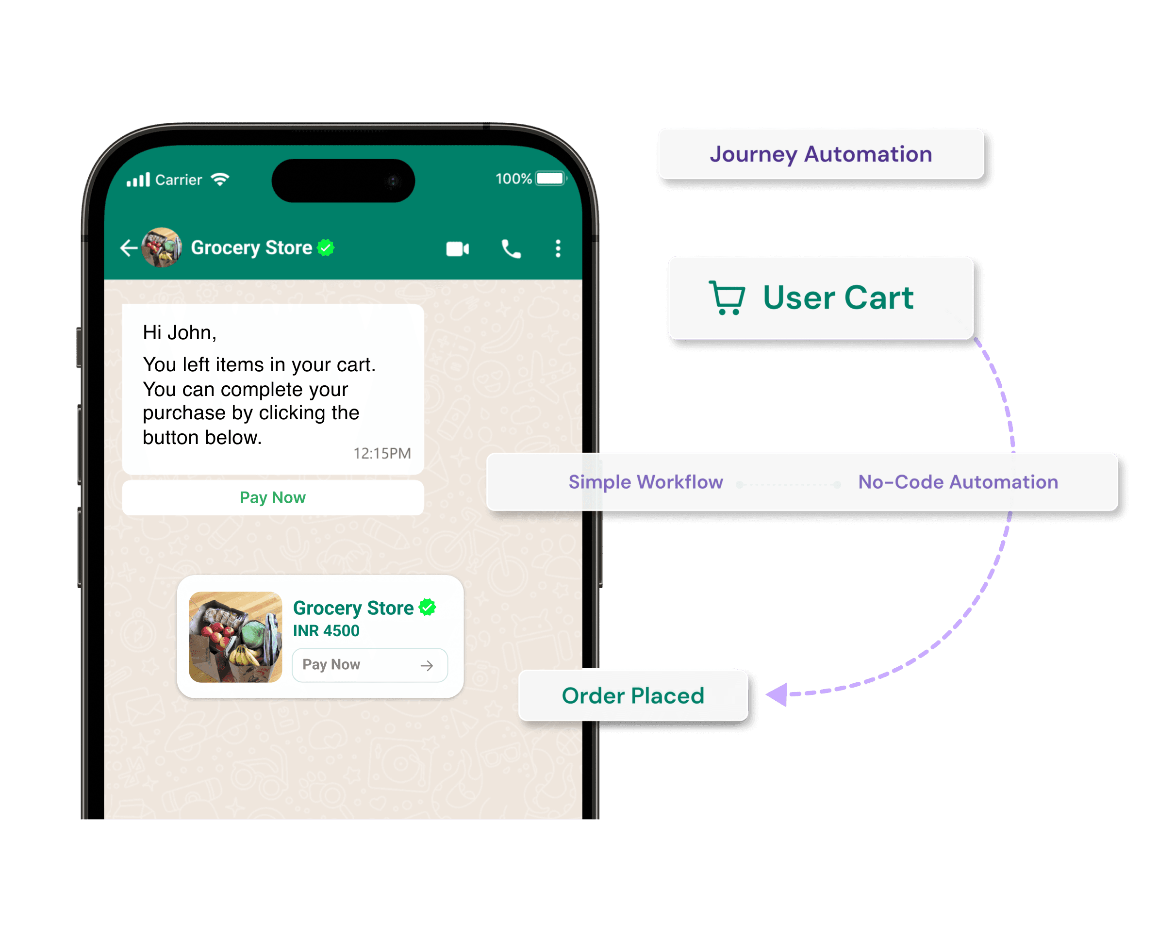 Build and launch automated journeys without engineering support. Recover carts, reduce COD risk, and keep customers updated automatically with WhatsApp workflows synced to Shopify and WooCommerce. Qualify, route, and follow up with leads using simple workflow logic.