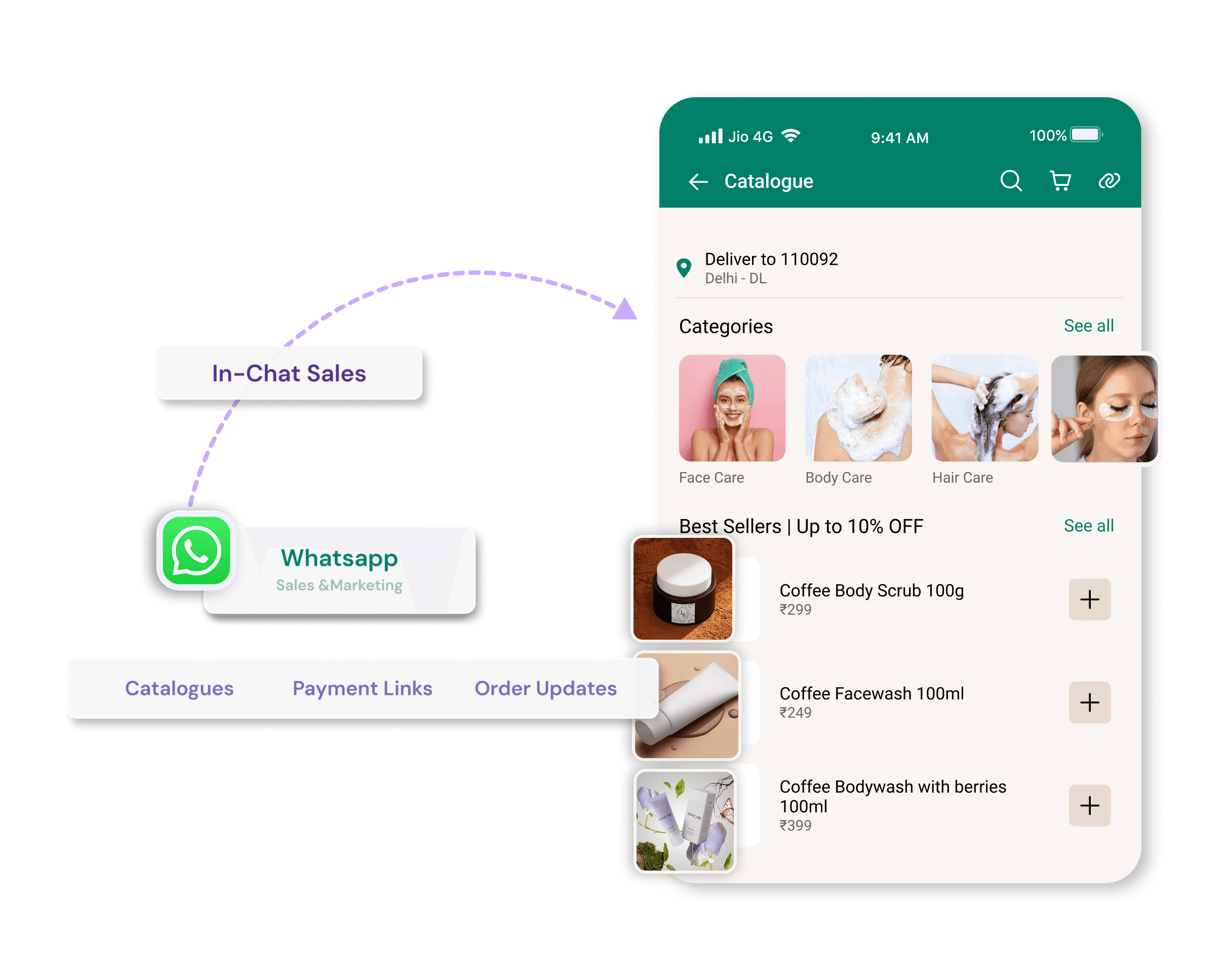 Share catalogs, payment links, and order updates inside chat so customers can buy where they already engage. Shorten the path from discovery to purchase.