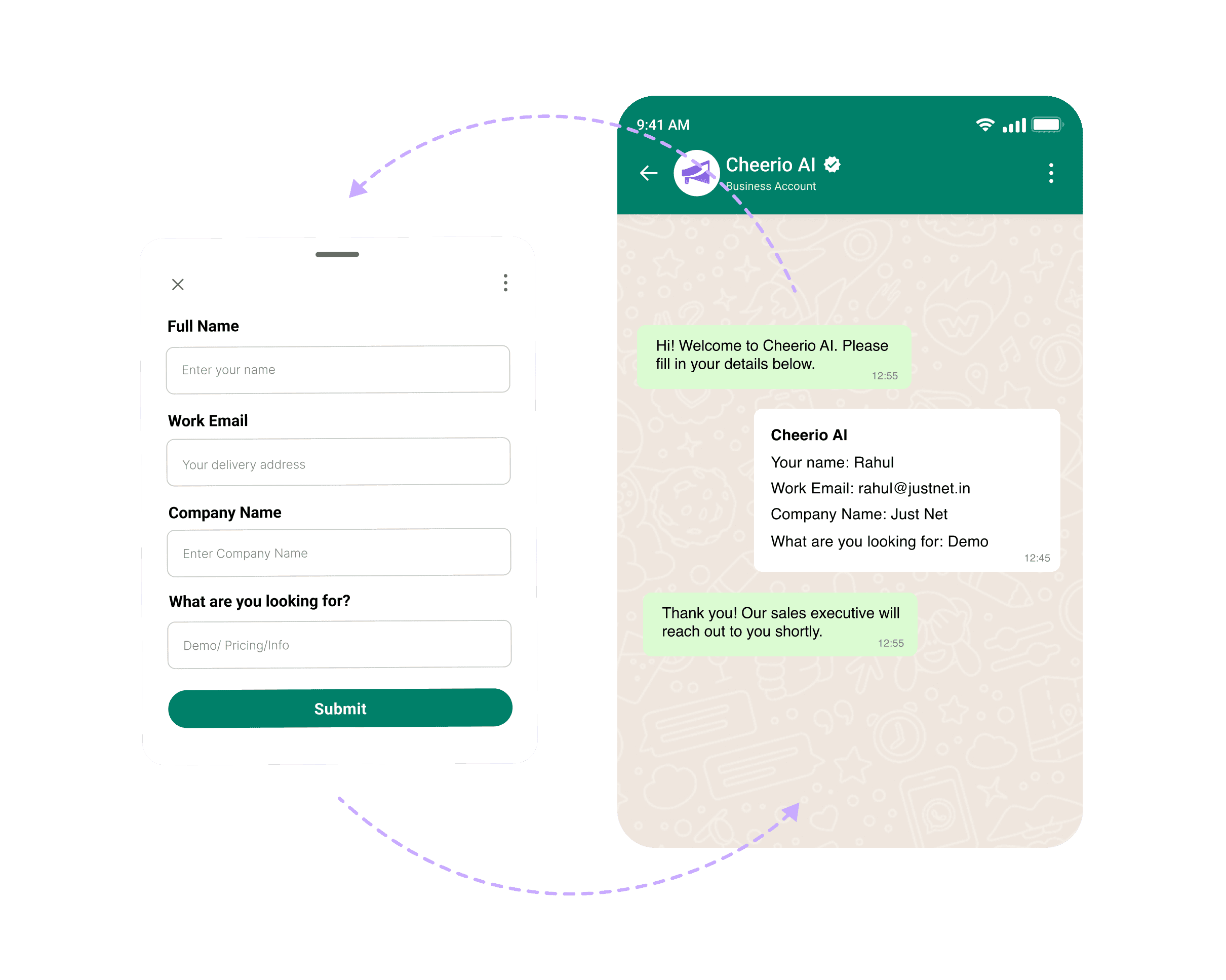 Create WhatsApp forms that mirror your website experience. Ask questions, capture details, and qualify leads in chat without redirects or drop-offs. Sync responses directly to your CRM and workflows for instant follow-up.