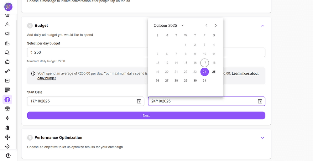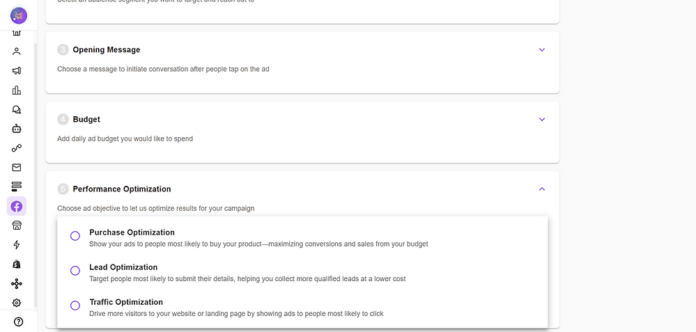 Ensure to select the right type of optimisation as per your campaign. If your goal is to convert a purchase, then select purchase, similarly for other cases