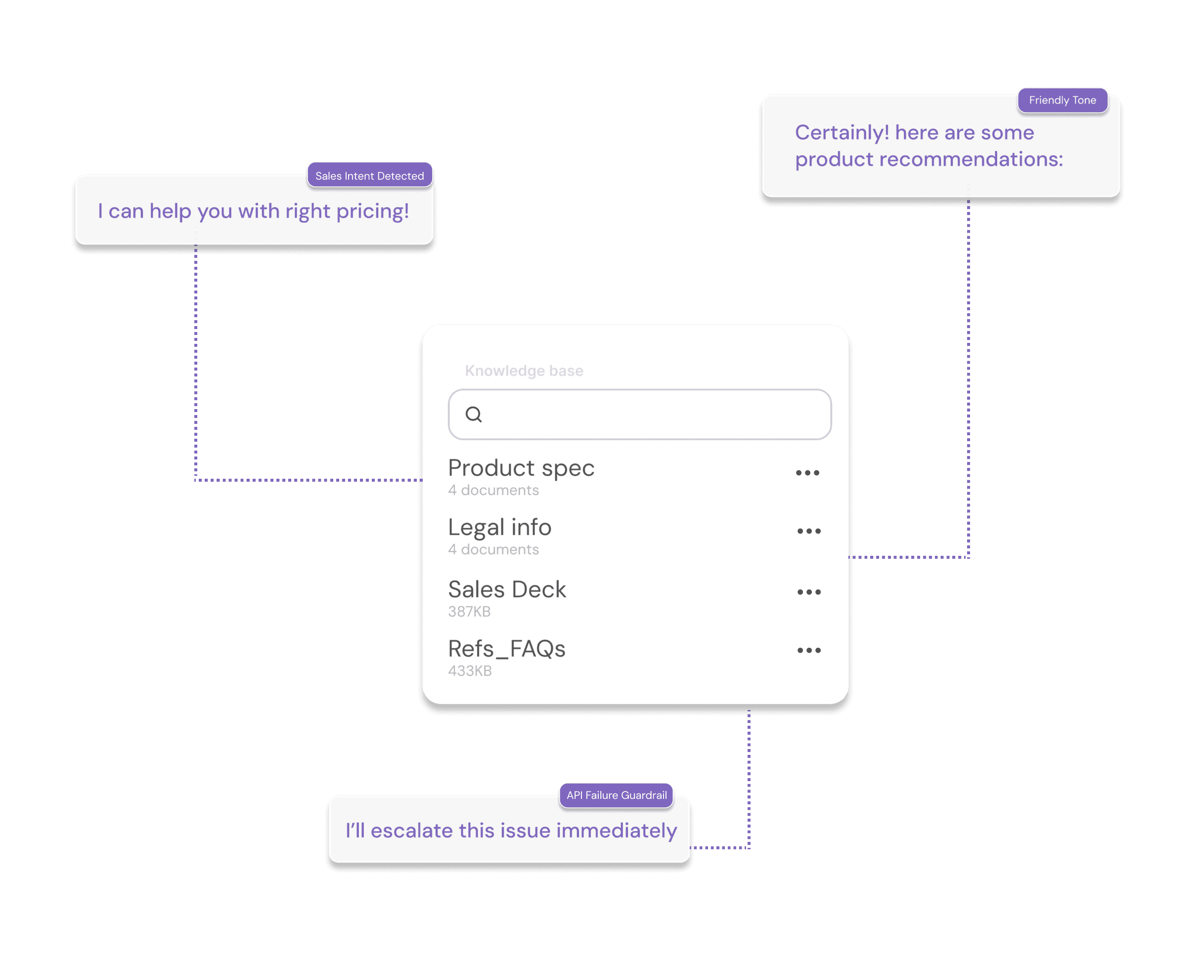 Define tone, intent handling, escalation rules, and guardrails for every agent. Shape how AI responds across sales, support, and operations so conversations feel consistent, contextual, and aligned with your brand. Automation that still sounds human.