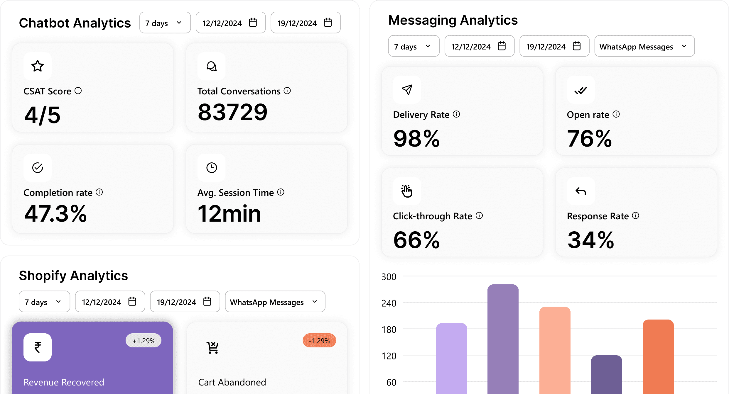 Track deliveries, reads, replies, clicks, and conversions across channels from one unified dashboard. Measure how each campaign and workflow performs, compare journeys, and identify what drives engagement and revenue.