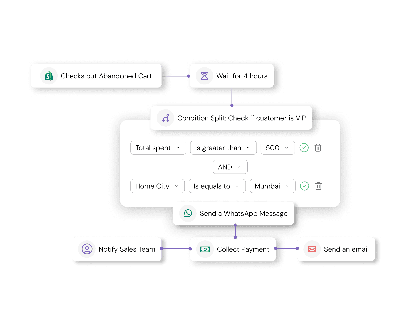 Turn triggers into decisive actions without manual intervention. Assign conversations to Agentic AI or human teams, route high-intent users to sales or support, collect payments inside workflows, send product catalogs, update your CRM, notify specific teams, or trigger follow-ups instantly based on context and priority.